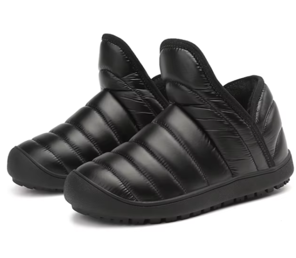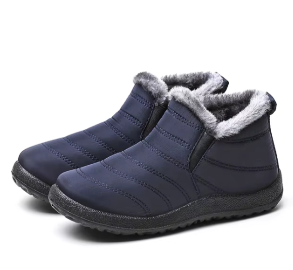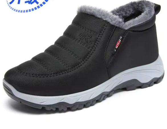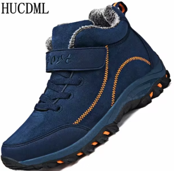 Мужские зимние кроссовки без шнуровки. Внутренняя отделка из хлопка, утеплены мехом для сохранения тепла. Верх водонепроницаемый, что делает обувь подходящей для дождливой и снежной погоды. Плоская подошва обеспечивает устойчивость и комфорт при ходьбе. Цвет — чёрный и синий, универсальные для повседневной носки. Удобная модель для зимнего сезона.