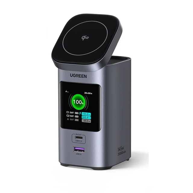 Модель объединяет проводную зарядку до 145 Вт и магнитную Qi2 15 Вт, позволяя заряжать до четырех устройств одновременно. Основной порт USB-C1 выдает 100 Вт, второй USB-C2 45 Вт, плюс USB-A и беспроводная площадка. Емкость 20000 мАч, полная зарядка за 2 часа (вход 65 Вт). Есть TFT-дисплей с отображением мощности, времени и тока, корпус весит 555 граммов, поддерживаются все актуальные протоколы PD 3.1, QC 4+, PPS, SCP. По сравнению с Baseus EnerGeek 145 Вт, у UGREEN чуть меньше портов, но больше функциональности: добавлена беспроводная зарядка Qi2, магнитная подставка и более информативный экран. Baseus практичнее для множества устройств, а UGREEN удобнее, как настольная станция и в поездках, где важна универсальность и порядок без лишних кабелей.