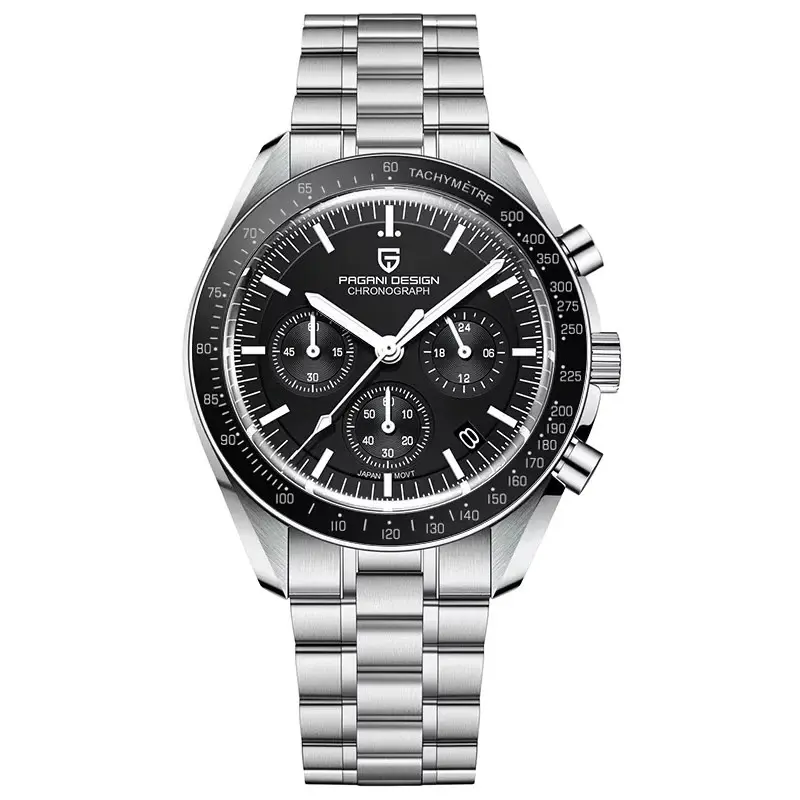 Японский кварцевый механизм TMI VK63 с хронографом, календарем и секундомером обеспечивает точность (+-1 сек/сутки), а водонепроницаемость 10 BAR (100 м) — часы выдерживают погружение в воду. Сапфировое стекло с AR-покрытием предохраняет от механических повреждений, а часы изготовлены из стали, что позволяет им выдерживать умеренные удары.