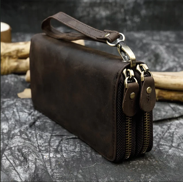 Этот кошелек уже немного больше предыдущей модели, и имеет больше отделений. По бокам кошелька есть два отделения на молнии, также еще одно отделение внутри, которое также закрывается на молнию. Сам кошелек закрывается с помощью кнопки, а внутри есть отделения для карт и купюр.