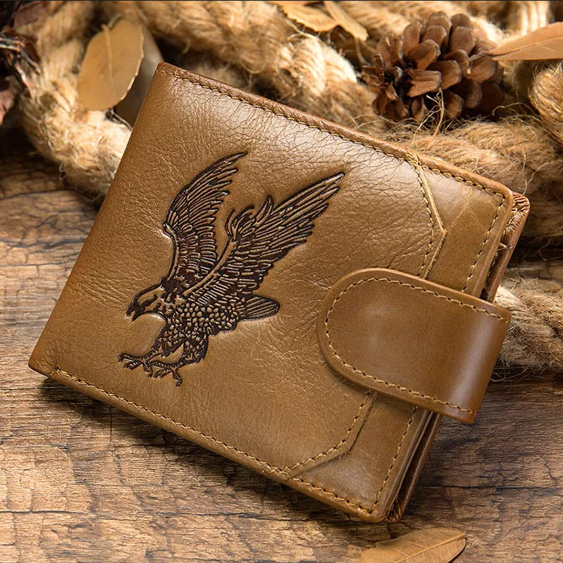 Следующий кошелек выглядит аккуратно и стильно, особая деталь — гравировка орла на передней части кошелька. Эта модель также имеет размеры 11*9,5 см, как и большинство в этой подборке. Отмечают, что кошелек изготовлен качественно и приятный на ощупь. Внутри кошелька можно найти множество отделений для карт и визиток, а также два отделения для купюр. А вот отделение для мелочи отсутствует.