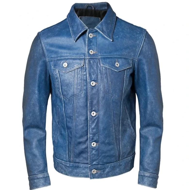 Немного зауженная куртка сделана из коровьей кожи в джинсовом цвете. Он может немного отличаться в реальной жизни от представленного на фото на маркетплейсе.