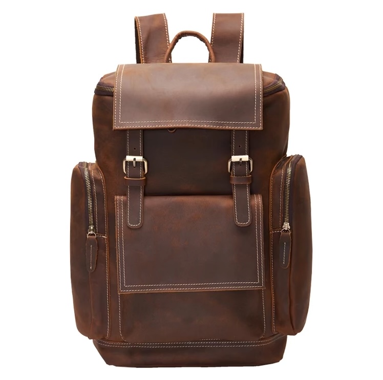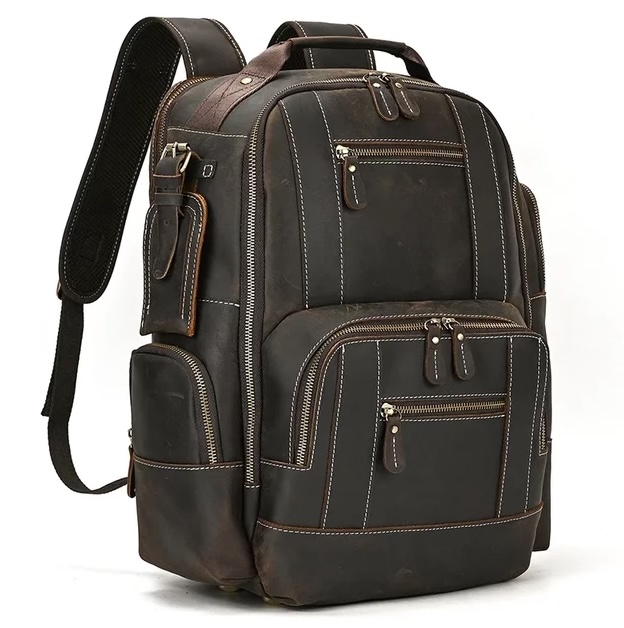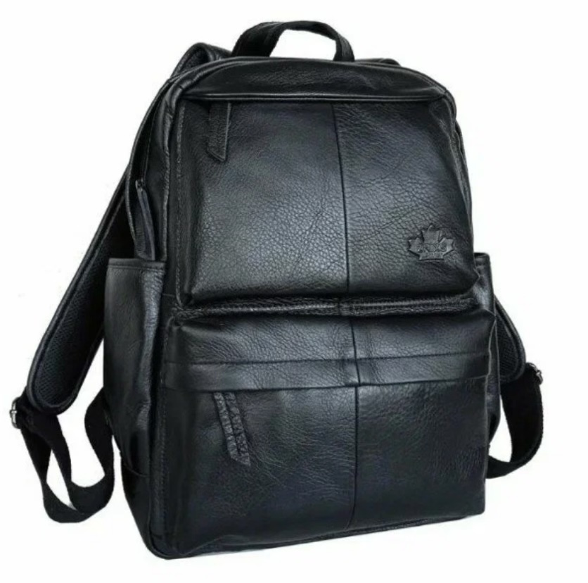 Выполнен из натуральной кожи и оснащен молниями в качестве застежек как основного отделения, так и дополнительных карманов. Разместить можно объем до 35 литров.