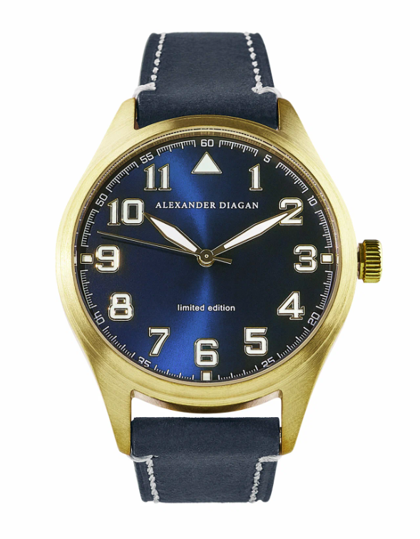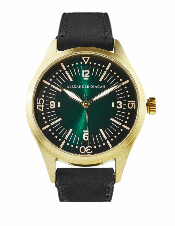 Еще одни часы от Alexander Diagan с механизмом Miyota Caliber 2035 оснащены центральной секундной стрелкой. Латунный корпус диаметром 41 мм и толщиной 6.6 мм подвержен естественному образованию патины в процессе эксплуатации. Циферблат выполнен по технологии Sunray с эффектом перелива в черно-зеленой гамме, арабскими цифрами и люминесцентным покрытием стрелок для ночной видимости. Минеральное стекло имеет антибликовую обработку. Водозащита класса WR30 (3 атм) обеспечивает устойчивость к брызгам воды. Часы комплектуются кожаным ремешком шириной 20 мм с максимальным обхватом запястья 24 см. Предназначены для активного использования, включая бег и туризм. Вес конструкции составляет 60 г.