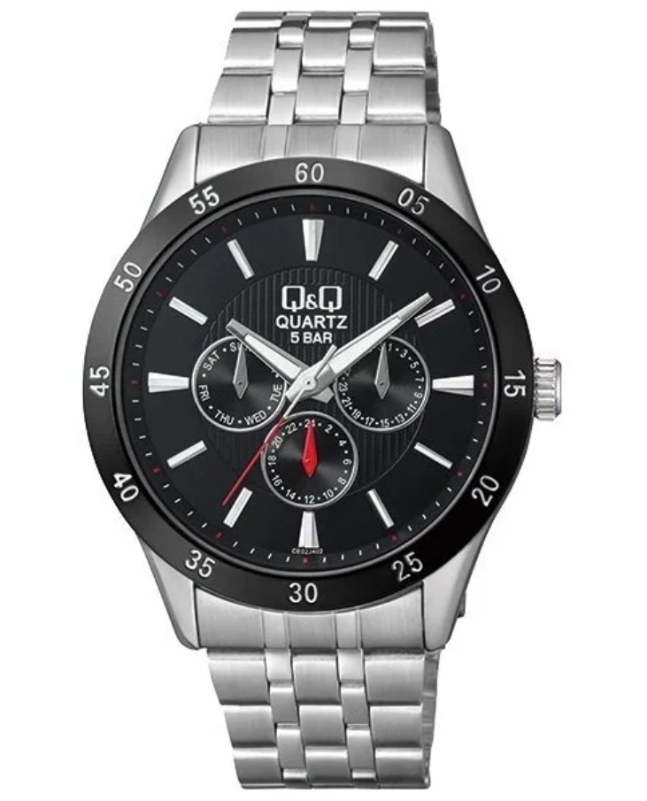 Японский кварцевый механизм установлен в латунном корпусе диаметром 44 мм с IP-покрытием. Аналоговый черный циферблат отображает дату и месяц посредством меток индикации. Минеральное стекло сочетается с водозащитой WR50. Стальной браслет контрастирует с полированной поверхностью корпуса. Производство осуществлено под контролем бренда Citizen.
