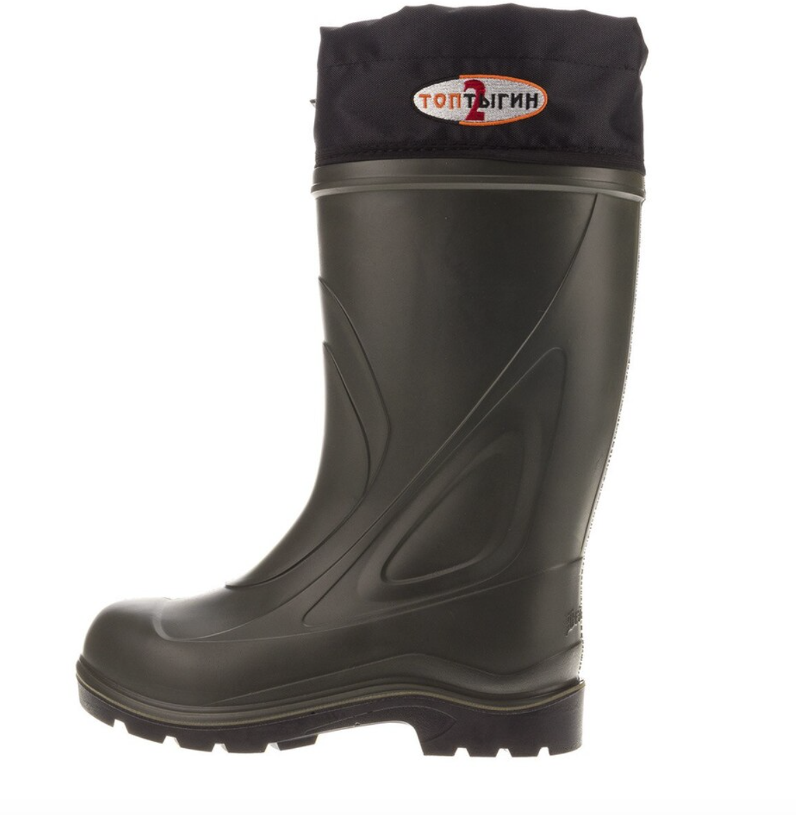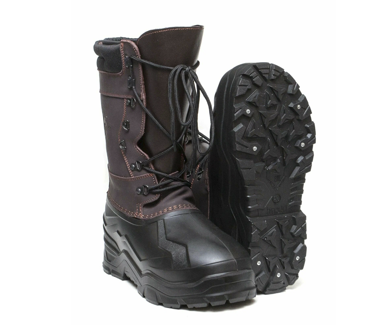 Нижняя часть выполнена из вспененного полиуретана. Это цельная оболочка, которая изолирует стопу от земли и не пропускает воду снизу. Материал остаётся работоспособным на морозе и не трескается. Подошва с глубоким открытым рисунком и встроенными шипами, рассчитана на снег и лёд. Под стопой лежит жёсткая стелька из ЭВА толщиной 4 мм, она отделяет ногу от холода и не впитывает влагу.