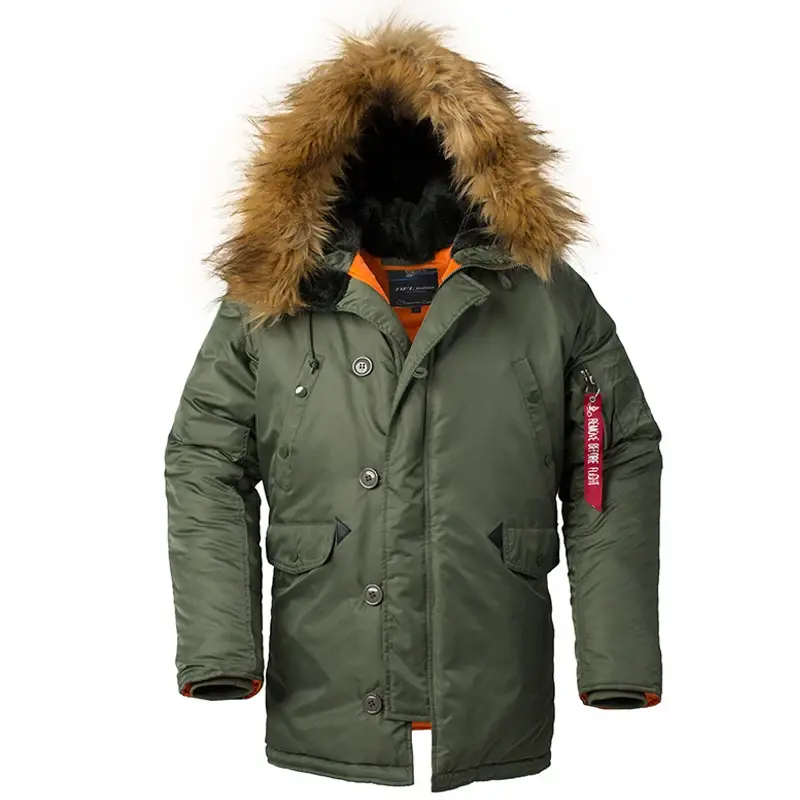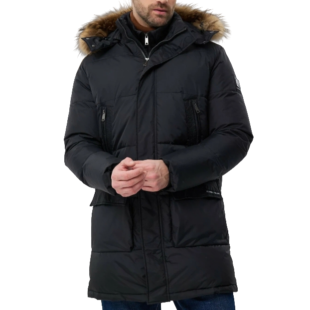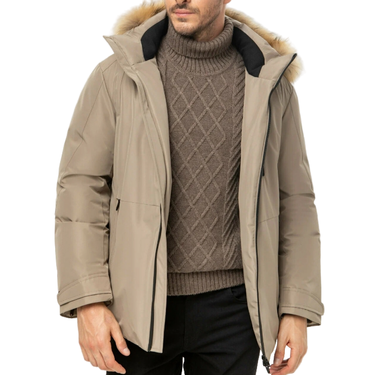 Парка оснащена глубоким и регулируемым капюшоном, который при необходимости можно снять. Он имеет меховую отделку из шерсти енота.