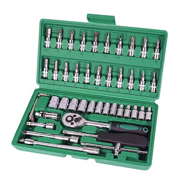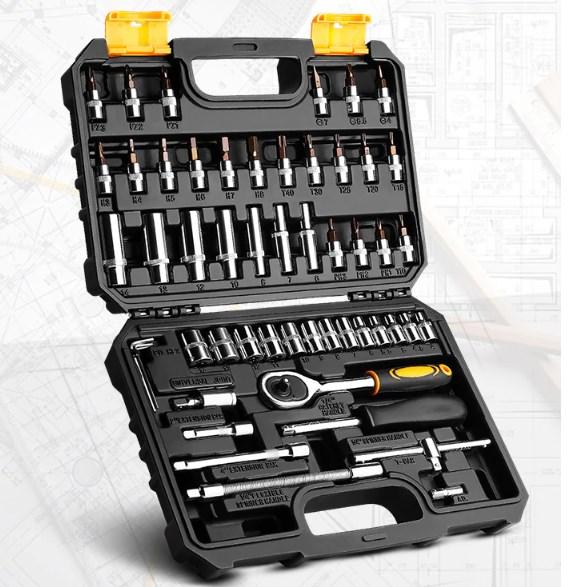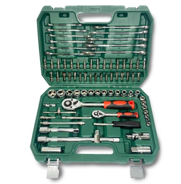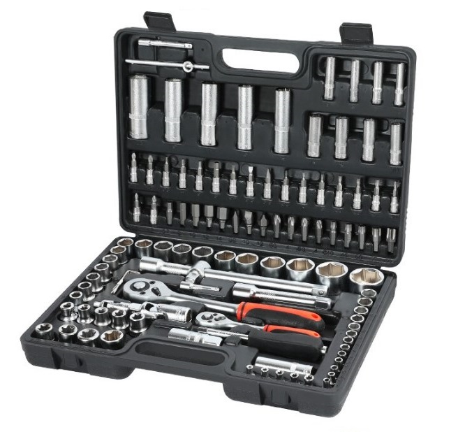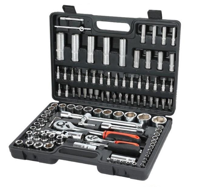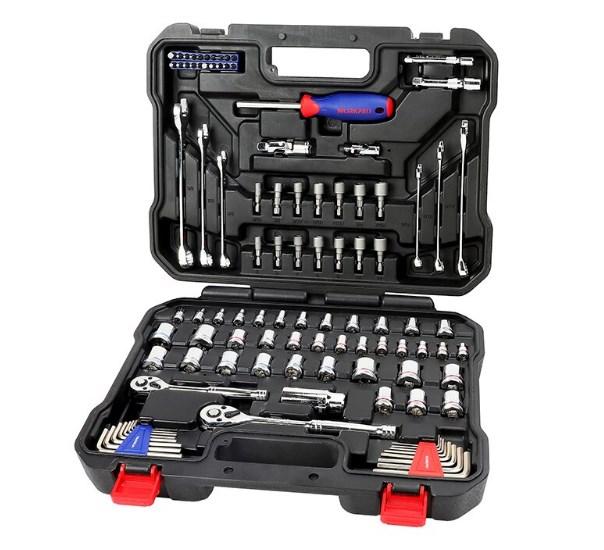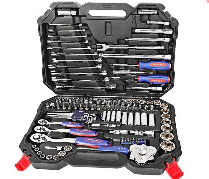 И начинает подборку набор инструментов от достаточно известного бренда Workpro, который хорошо зарекомендовал себя на рынке различного ручного и электрического инструмента. При оформлении заказа можно выбрать одну из нескольких вариаций набора. Приведенный на фото набор поставляется в удобном пластиковом кейсе, в комплекте имеется ряд рожковых и шестигранных ключей, а также много накидных головок разного диаметра. В наборе также имеются различные дополнительные насадки для накидных головок, которые помогут открутить гайки в труднодоступных местах.