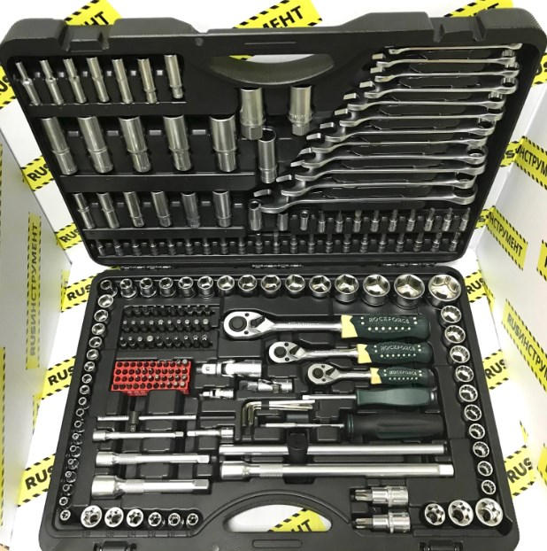 Набор от компании Rock Force уже более укомплектованный и подходит для выполнения разных задач, имеет в себе 216 компонентов. Для удобства использования в комплекте имеется три накидных ключа под сменные головки разного размера. Также в комплект набора входит большое количество стандартных и специальных бит для отвертки. Еще набор может похвастаться наличием двенадцати наиболее распространенных рожковых ключей. Для жителей РФ товар может быть доставлен с местного склада.