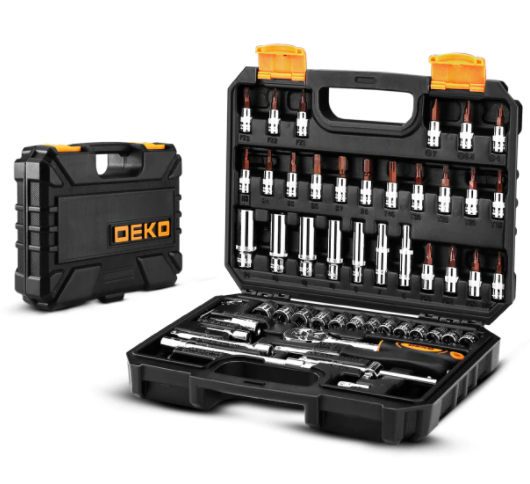 Набор инструментов от фирмы Deko неслучайно занимает верхнюю строчку нашей сегодняшней подборки, так как марка предлагает высокое качество за довольно низкую стоимость. С помощью инструментов прекрасно решаются задачи по ремонту автомобиля на полупрофессиональном уровне. Состав набора включает в себя 53 наименования предметов, внешний вид соответствует описанию на 100%. Здесь есть и торцевые головки, и динамометрический ключ с трещоткой, ну, и конечно же, другие инструменты, которые обязательно пригодятся автолюбителям.