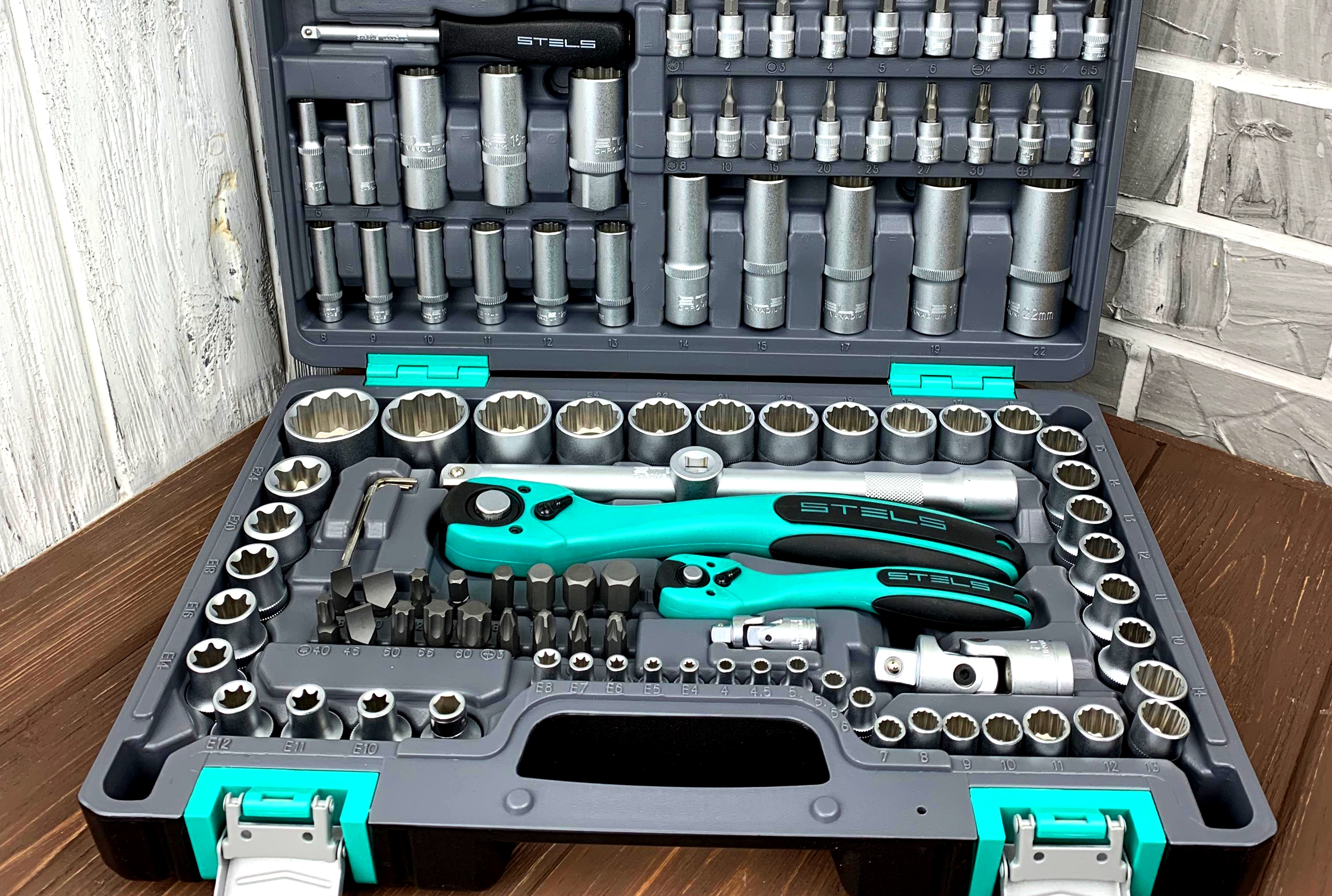 Набор поставляется с надежной трещоткой, которая позволяет быстро откручивать гайки и болты разного диаметра. Трещотка отличается плавным и точным вращением. В наборе большой ассортимент торцовых головок и многого другого полезного инструмента.