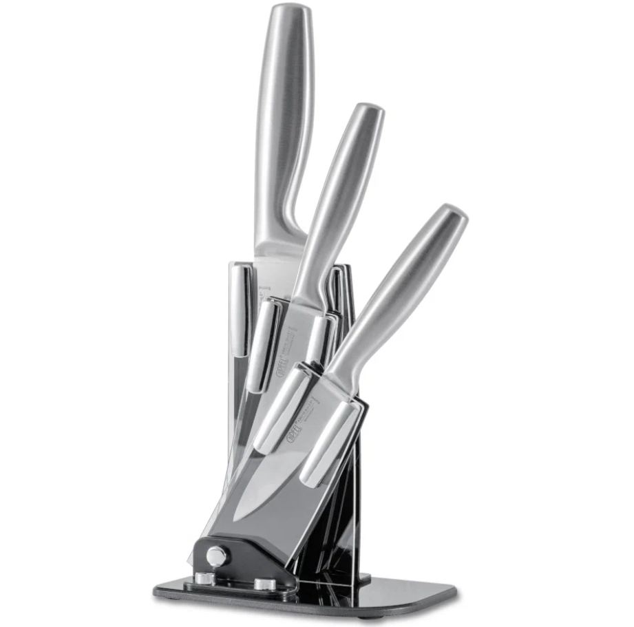 Набор из трех ножей включает в себя также и акриловую подставку под них.