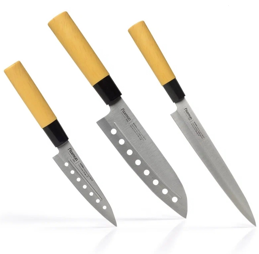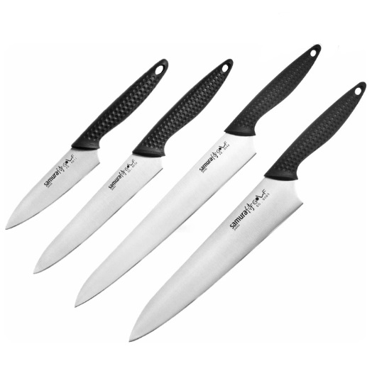 Еще один набор ножей от Samura, который включает 3 ножа с разной длиной лезвия (максимальная составляет 20,8 см) и заточенных под разные задачи: от резки фруктов/овощей до разделки мяса. Их лезвия выполнены из нержавеющей стали, а рукоятки из пластика. Таким образом, они имеют долгий срок службы, а во время готовки не выскальзывают из рук.