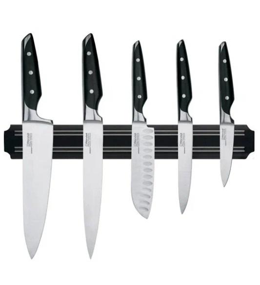 Вместе с ножами в наборе идет магнитный держатель для них. Его можно повесить на стену. Длина держателя составляет 36 см. Говоря про сами ножи, то в наборе из всего 5: универсальный, овощной, филейный, сантоку и шеф-нож.