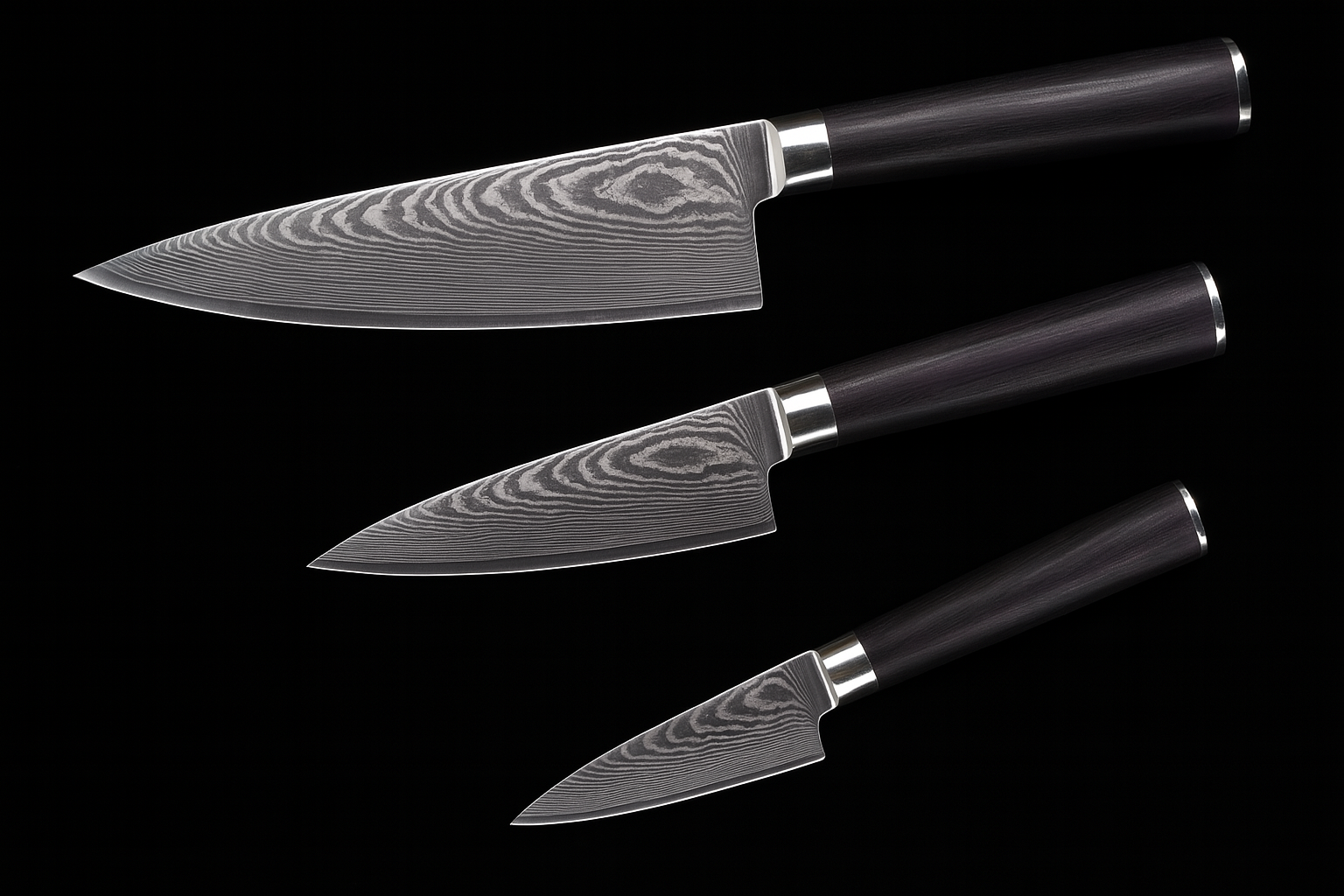 Набор состоит из ножа, предназначенного для резки овощей, фруктов и зелени, ножа-слайсера, способного выполнять тонкую нарезку продуктов, универсального ножа и шеф-ножа, который подойдет для большей части кухонных задачи (например, шинковка или рубка).