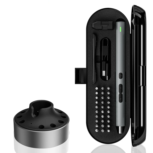 Мини отвертка для мелких работ, которая выполнена в формате ручки и весит около 310 г. Длина корпуса — 184 мм при диаметре 20 мм, в комплекте идет аккуратный кейс размером 210x88 мм для хранения. Устройство работает от встроенного литий-ионного аккумулятора емкостью 800 мАч, заряжается через порт Type-C примерно за 90 минут и рассчитано на работу при напряжении 5 В.