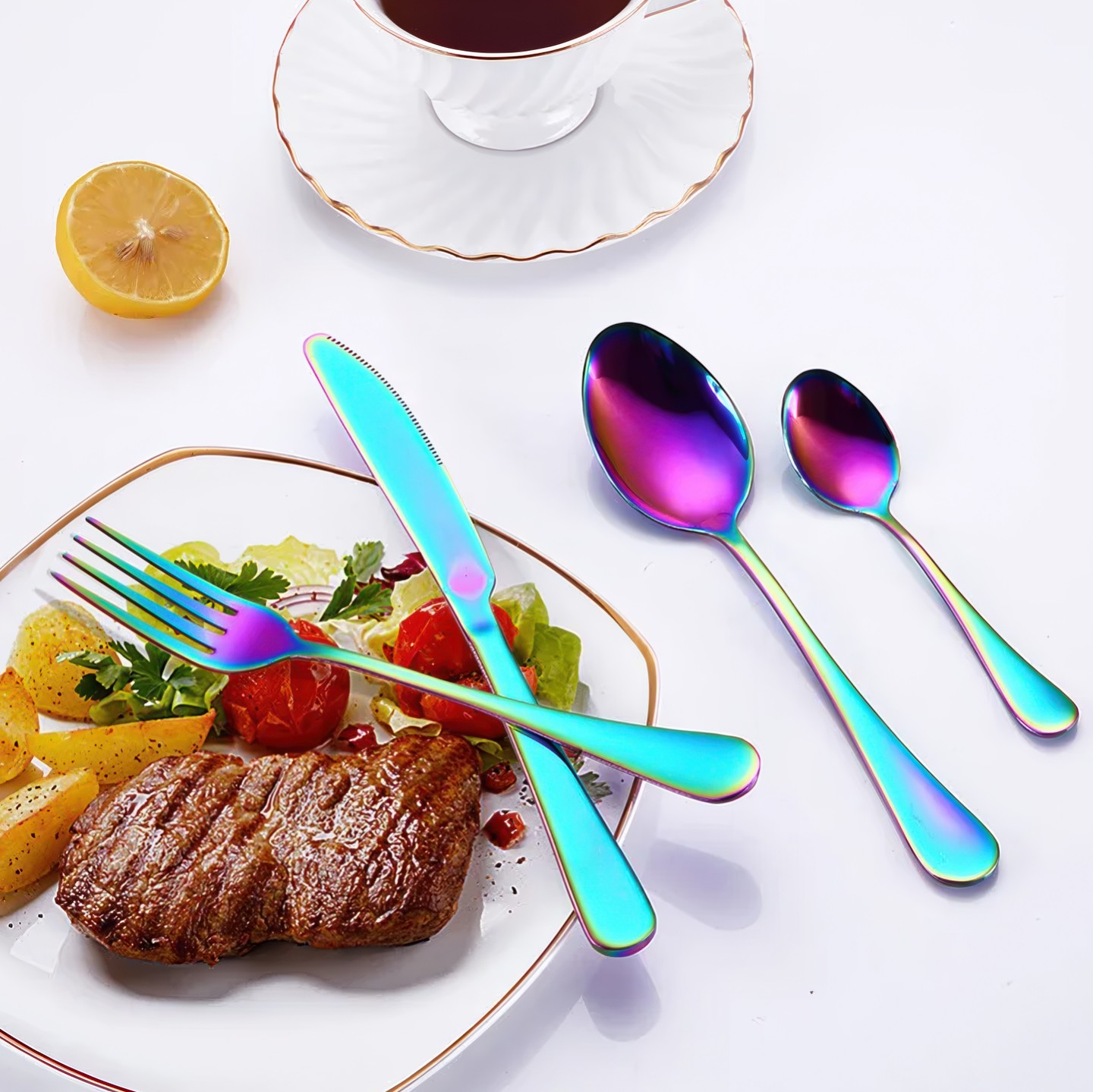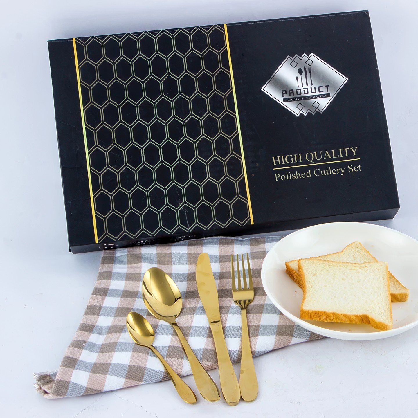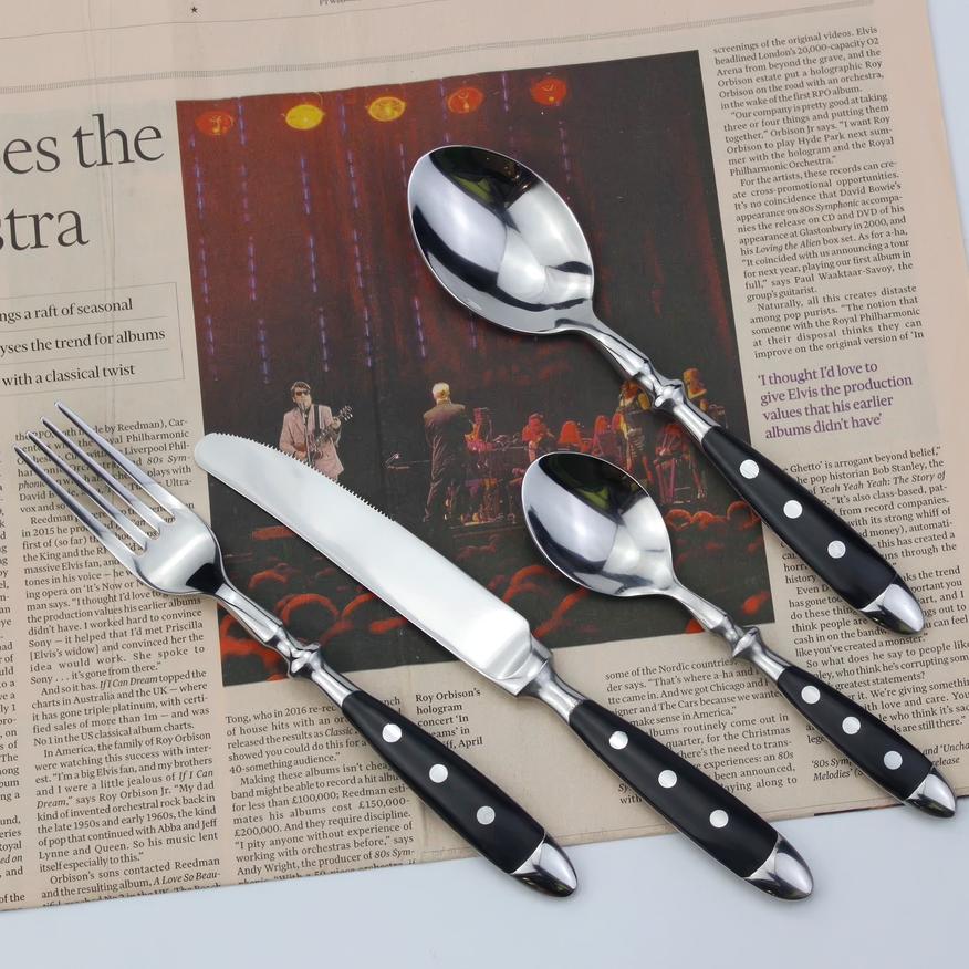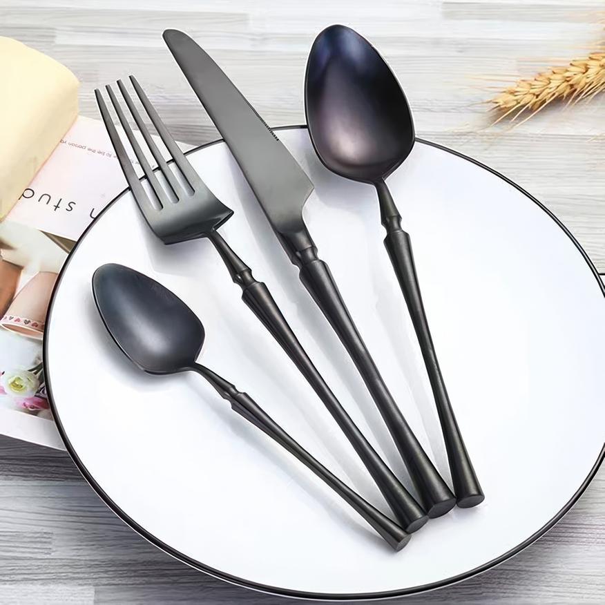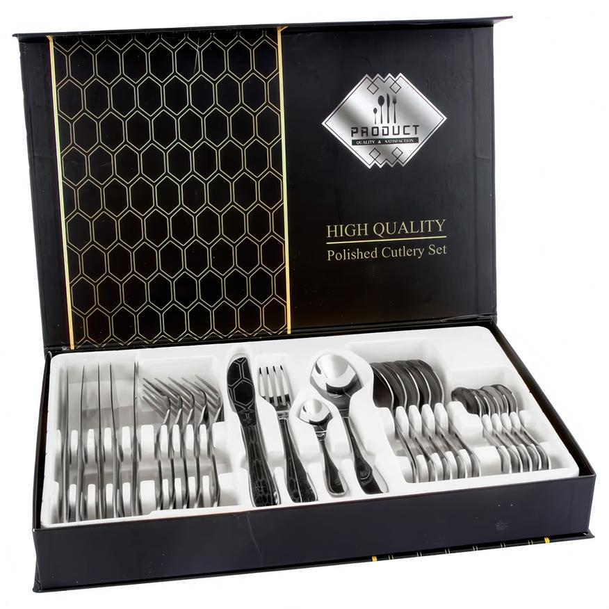 Набор рассчитан на 6 персон, каждой полагается четыре стандартных прибора. Покупателям доступен выбор между чёрным, золотым, матово-золотым и некрашеным вариантами исполнения. Особого упоминания заслуживает использование стали марки 304 (08Х18Н10) — износо- и коррозийно-стойкого материала, способного пережить не одно поколение владельцев без малейших признаков «усталости».
