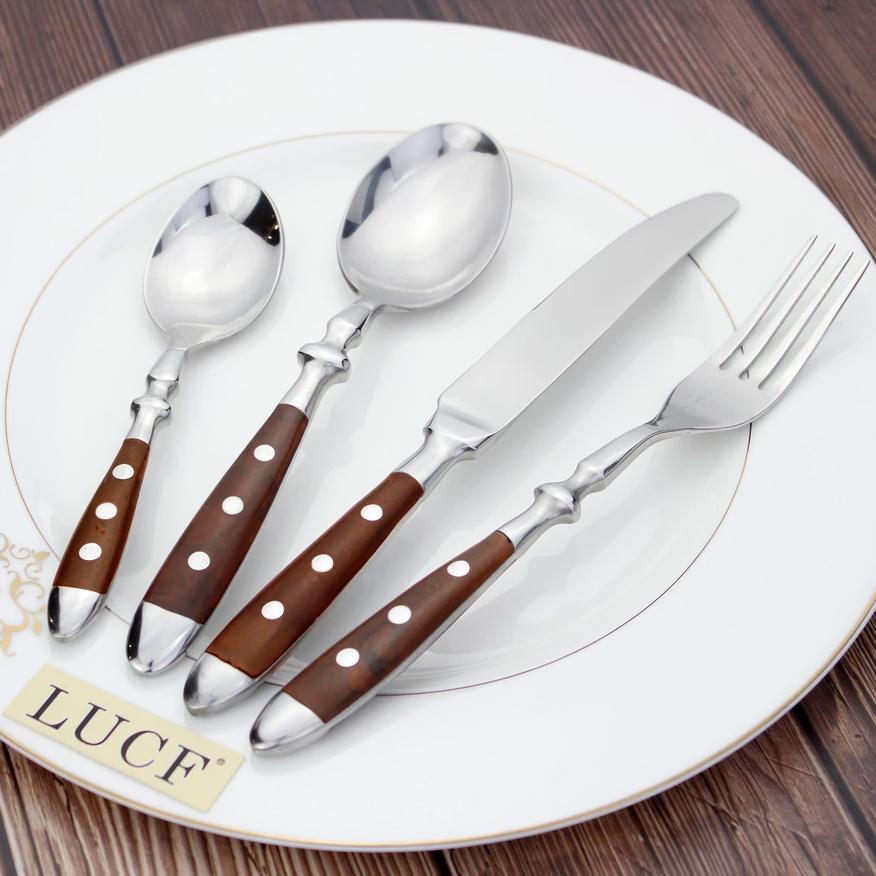 Следующий участник обзора — набор от LUCF, демонстрирующий классический европейский подход к дизайну столовых приборов. Здесь использована высококачественная сталь марки 430, дополненная наборными бакелитовыми рукоятками. Такое сочетание материалов характерно для премиальной посуды и позволяет добиться оптимального баланса между практичностью и эстетикой.