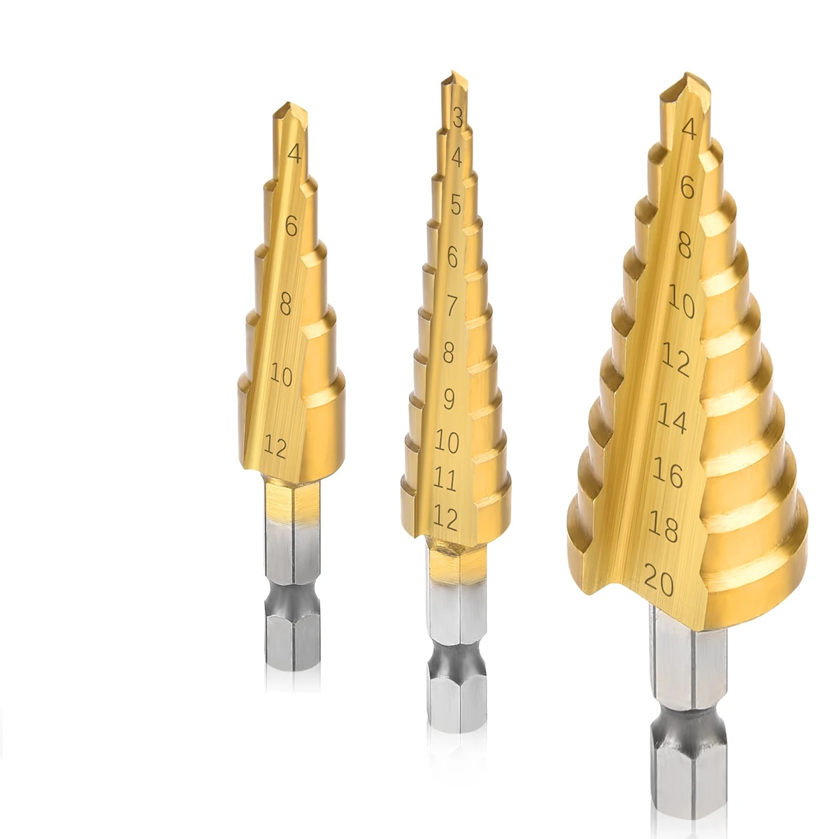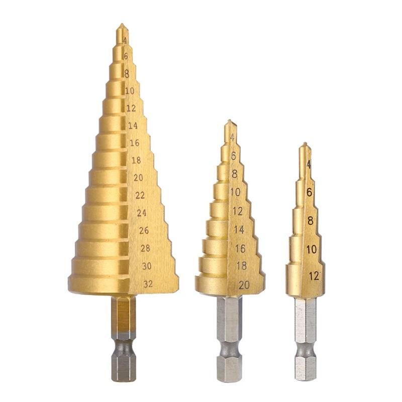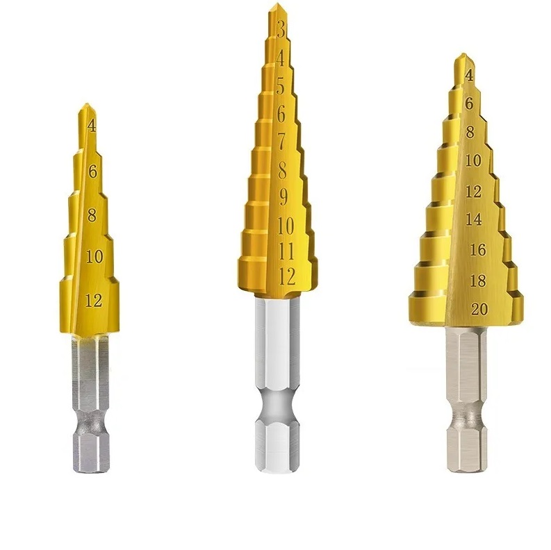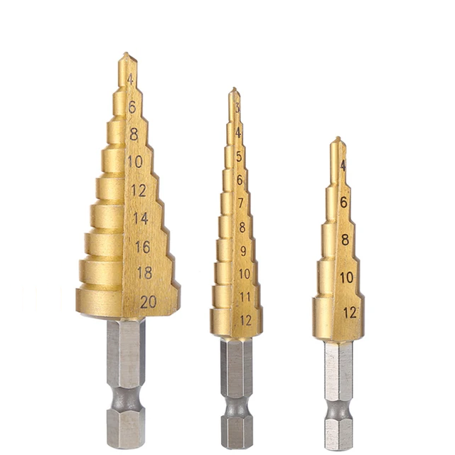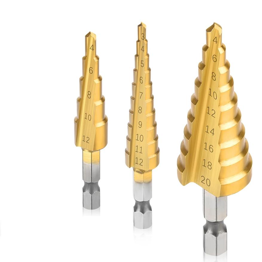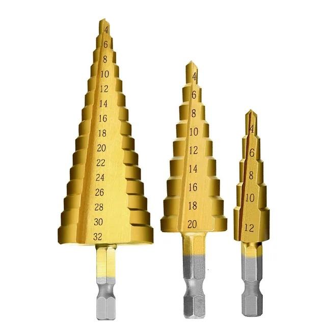 Три конических сверла с диапазонами от 4 до 32 мм. Выполнены из быстрорежущей стали 4241 и покрыты нитридом титана для защиты от износа. Прямые канавки обеспечивают аккуратное сверление без заусенцев. Подходят для работы с деревом, пластиком и тонким металлом (твёрдость до 25 HRC).