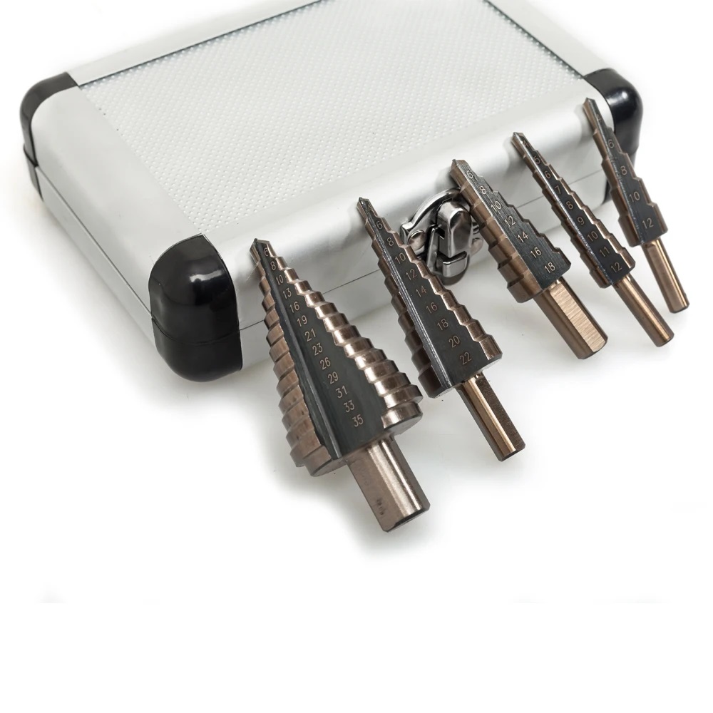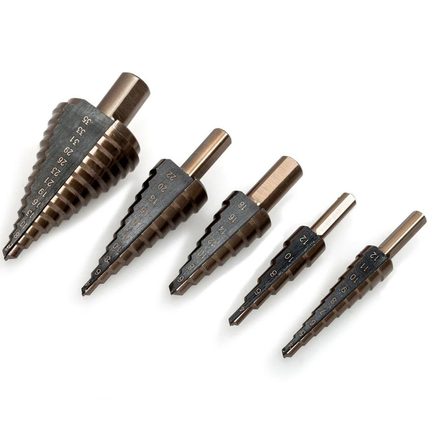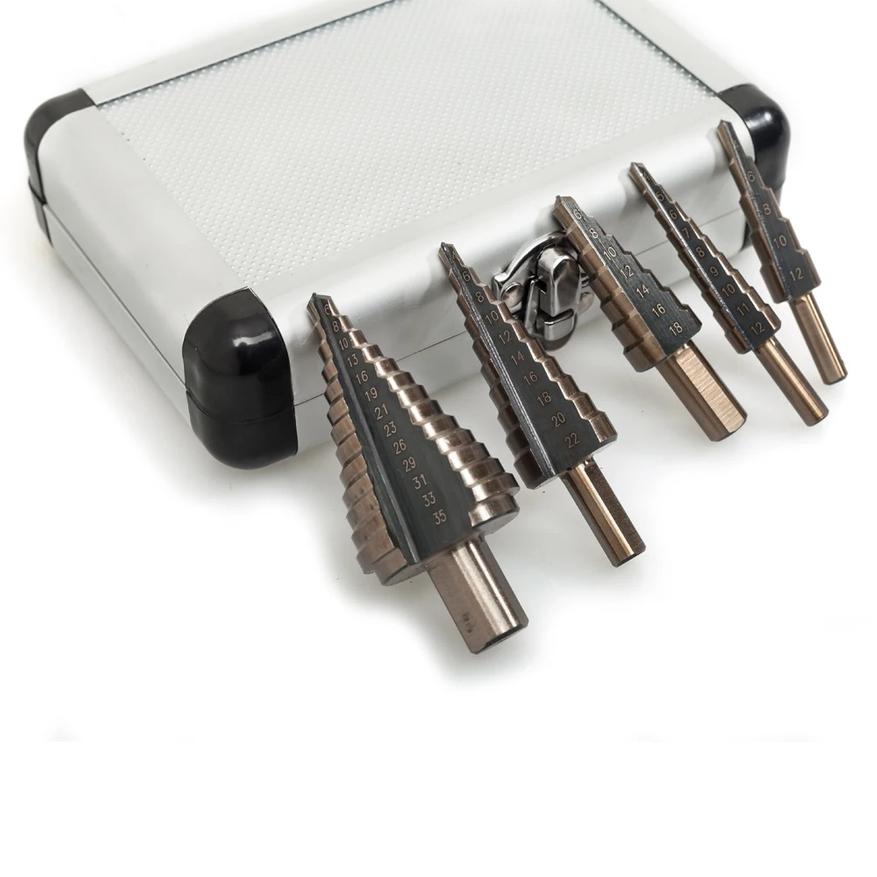 В этой подборке 10 наборов ступенчатых сверл с прямой канавкой. Их конструкция немного отличается от привычных винтовых: прямая канавка не закручивается по спирали, а идёт строго вдоль оси. Они меньше вибрируют, аккуратнее режут тонкий металл и не рвут кромку. Подобные сверла часто используют в монтажных работах, при установке электрооборудования, в кузовном ремонте и при сборке металлических конструкций.