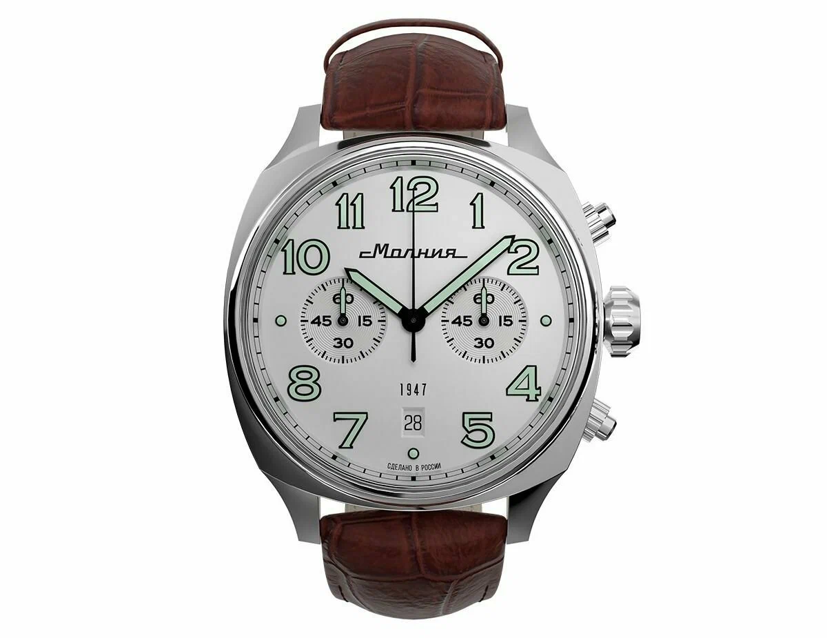 Циферблат оформлен центральными часовыми, минутной и секундной стрелками, а также дополнительным счётчиком секундомера.