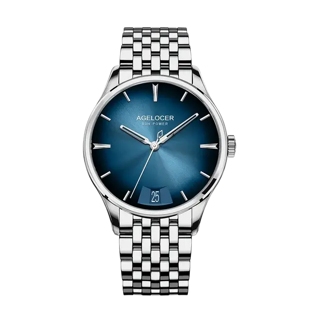 Циферблат синего цвета с градиентным переходом дополнен люминесцентными стрелками и индексами для считывания времени в темноте.