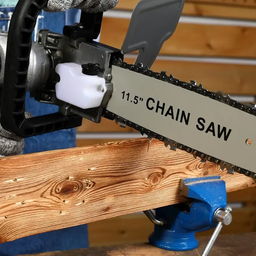 Эта насадка превратит вашу проверенную «болгарку» в настоящую цепную пилу с длиной шины 11.5 дюймов. В комплектации есть весь набор для крепления насадки, а также есть защитный щиток и большая рукоятка, наподобие бензопилы. Разумеется, в комплекте и шина на 11.5 дюймов и пилящая цепь. По качеству люди отписываются, что она вполне способна попилить кусты, поддоны и различный строительный мусор, ради которого покупать настоящую цепную пилу не хочется. Рекомендовано для УШМ покрупнее.