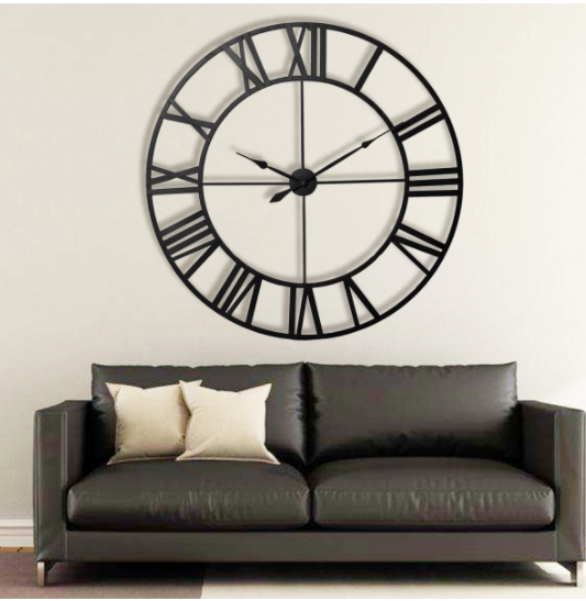 Еще одни большие часы отличающиеся красивым дизайном. Благодаря простой и благородной форме они прекрасно впишутся в интерьер любого дома. Конструкция выполнена из стали черного цвета с высокоточной лазерной резкой. Диаметр изделия составляет 80 см, толщина 2,2 см. Стрелки часов длинные, что позволяет им дотягиваться до циферблата. Кроме того, часы имеют бесшумный ход и высокую точность. Питаются от одной батарейки типа АА, которая не входит в комплект.