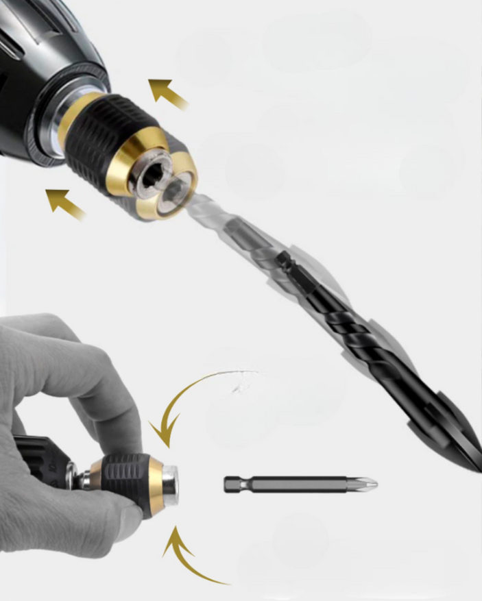 Хвостовик выполнен в стандартном шестигранном формате, что обеспечивает совместимость с большинством бит и крепежей. Насадка снабжена магнитным фиксатором, удерживающим биты во время работы.