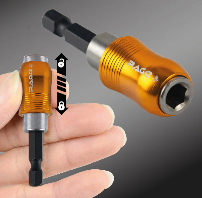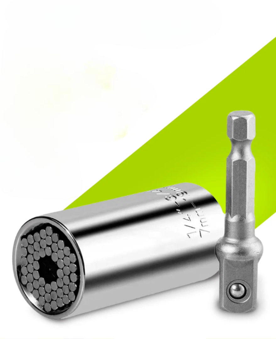 Эта насадка представляет собой многоразмерную торцевую головку, способную подстраиваться под разные крепежи. Она работает с крепежными элементами благодаря системе подпружиненных штифтов, которые подстраиваются под размер гайки или болта. В комплекте предусмотрено три адаптера с посадочными размерами 1/4, 3/8 и 1/2 дюйма.