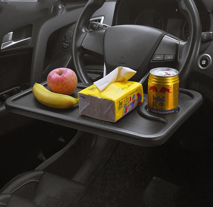 В зимней дороге на остановке, гораздо приятнее перекусить или поработать за ноутбуком, не выходя из машины. Поможет в этом съемный столик, который устанавливается прямо на рулевое колесо. Аксессуар двухсторонний, с одной стороны удобные выемки для продуктов, а с другой ровная поверхность. Закрепляется на нижней дуге руля. На странице товара есть вариант и для задних пассажиров.