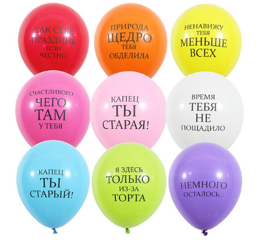 Товар строго для людей с чувством юмора. Чтобы разнообразить праздник и добавить долю юмора в поздравления, продается комплект шариков с «маргинальными» надписями. В комплекте 9 шаров с разными надписями. Диаметр шариков, в надутом состоянии, около 30см. На выбор есть цветные и черные. В магазине есть и другие варианты, например, с формой шара в виде звезды.