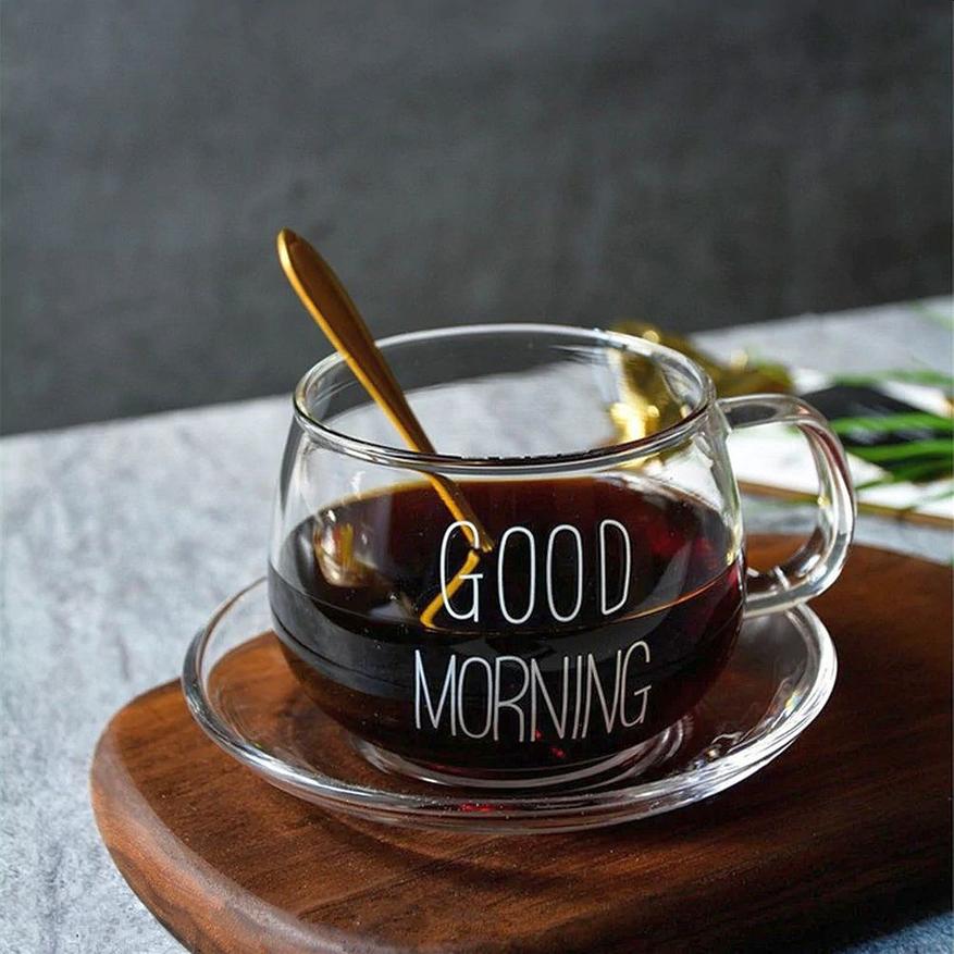 Простая, пузатая и объемная кружка с надписью желающей «Доброго утра» (правда на английском языке). Наливаем чай или кофе — что еще нужно для хорошего начала дня. Объем напитка, который кружка может вместить около 400мл. Подойдет не только для горячих и холодных напитков, но и чтобы поместить в него йогурт или сделать завтрак из хлопьев.