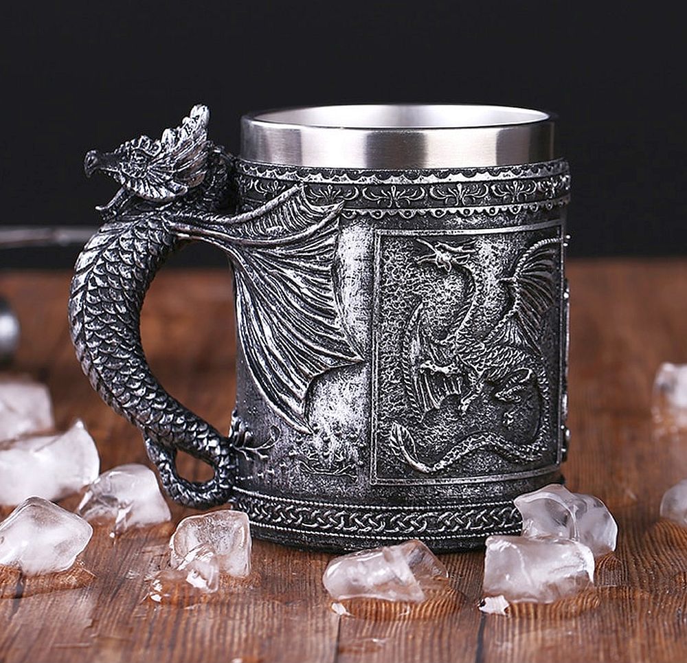 На странице товара любители фэнтези найдут для себя вариант кружки по душе. Весьма большой выбор емкостей в форме драконов, рыцарей, черепушек итд. По отзывам, весьма неплохое качество изготовления внешних элементов антуража и детализации. Основная часть, куда наливаем напиток, изготовлена из нержавейки. Емкость 450мл.