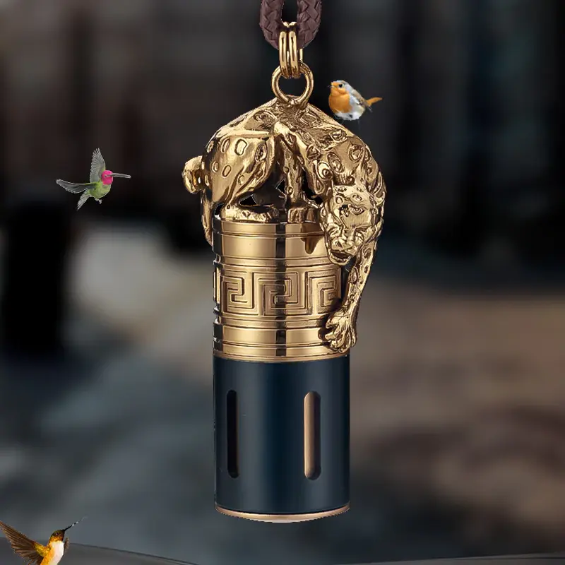 В наборе — держатель для крепления к решетке автомобиля, кожаный ремешок для подвешивания и два сменных ароматизатора.