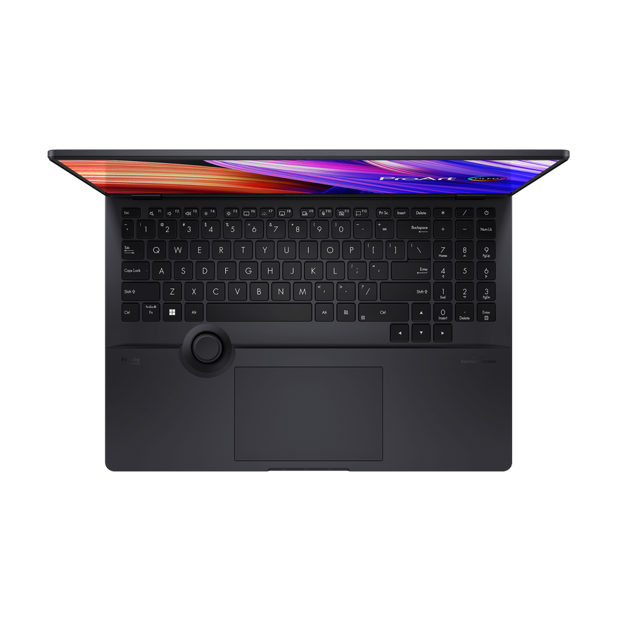 ProArt Studiobook 16 предлагает широкие возможности для работы с графикой и видеоконтентом. Чуть ниже клавиатуры располагается колесико «ASUS Dial» для быстрого доступа к ряду функций в ПО от Adobe (Photoshop, Premiere Pro, AE