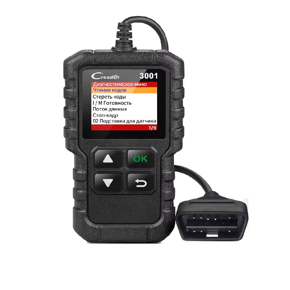 Проводной автосканер с цветным экраном и русскоязычным интерфейсом. Работает напрямую от разъёма OBD-II, не требует смартфона или ПК. Поддерживает основные функции: чтение и сброс ошибок двигателя, отображение параметров в реальном времени, проверку готовности систем. Совместим с большинством автомобилей начиная с 2000 года, но ограничен только системой OBD2, доступ к модулям ABS, SRS и кодированию отсутствует. Беспроводные подключения не поддерживаются.