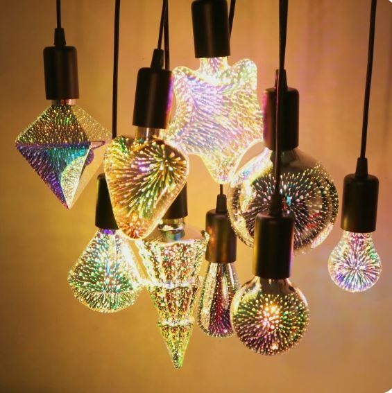 Очень красивая лампочка, при взгляде на которую создаётся впечатление, что внутри колбы взорвался настоящий фейерверк, состоящий из множества ярких завораживающих цветных огней устремлённых от центра к периферии. Выглядит очень круто. Лампочка качественная, имеет долгий срок службы, низкое энергопотребление. Мощность 6Вт, можно использовать в качестве декоративного ночника. В продаже разные формы колбы.