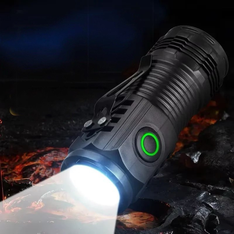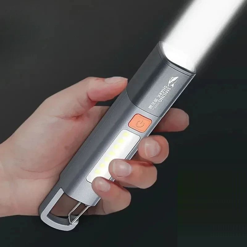 Это городской фонарик с упором на аварийные и бытовые сценарии, без перегруза функциями. Корпус пластиковый, легкий, вес около 70 граммов, длина примерно 15,5 см, спокойно помещается в рюкзак, бардачок или ящик с инструментами. Основной свет построен на светодиоде XPE с яркостью до 1200 лм, есть режим яркого света и вспышки, плюс боковая COB-панель для рассеянного освещения, когда нужно подсветить рабочую зону рядом. Дальность небольшая, до 50 метров. Аккумулятор встроенный, заряжается по USB, влагозащита базовая, на уровень повседневных брызг и дождя. Есть клипса и проушина под карабин, так что фонарик можно носить на рюкзаке или кармане. В целом, это аварийный фонарь для дома, машины и повседневного ношения.