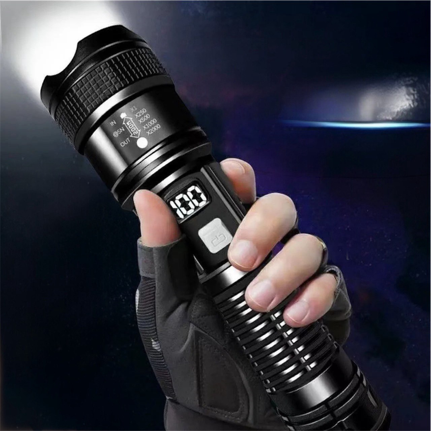На фоне предыдущего смотрится уже не как аварийный брелок, а как попытка сделать универсальный инструмент с акцентом на дальний свет. Здесь есть регулируемый зум, можно переходить от рассеянного света к узкому лучу, и по задумке он должен светить далеко, заявляют больше 500 метров. Корпус пластиковый, ABS, влагозащита заявлена вплоть до IPX6, в отличие от J031, который рассчитан на ближние сценарии. Интересная особенность — функция power bank и цифровой индикатор заряда. Но при этом мощность всего 5 Вт. В итоге по сравнению с J031, этот фонарик выигрывает в дальности, функциональности и универсальности, но проигрывает в компактности.