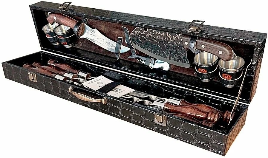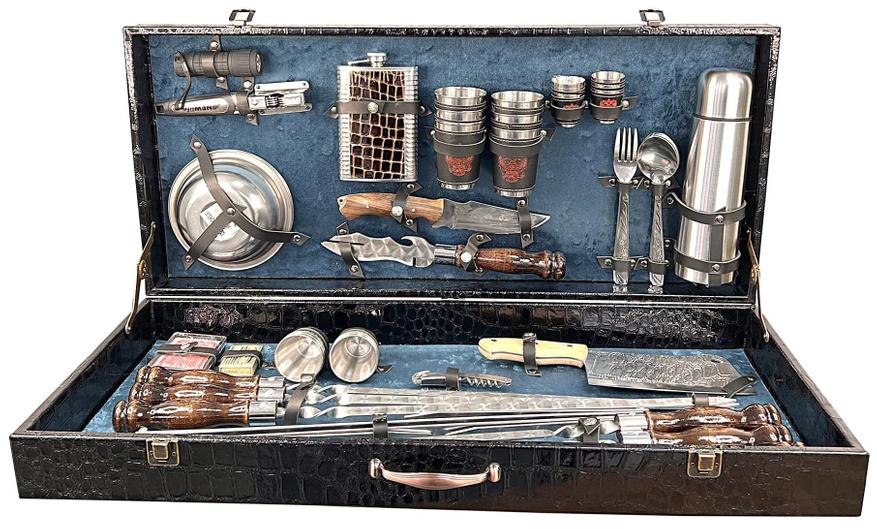Данный набор упакован в стильный и прочный чехол, обтянутый эко-кожей, сделанный под кожу крокодила, внутри обшит велюром. Продавец предлагает два варианта: один — синий, второй — красный велюр, на ваш вкус. Сам набор состоит из 53 предметов. Сюда входит все необходимое для приготовления шашлыка и других блюд на природе.
