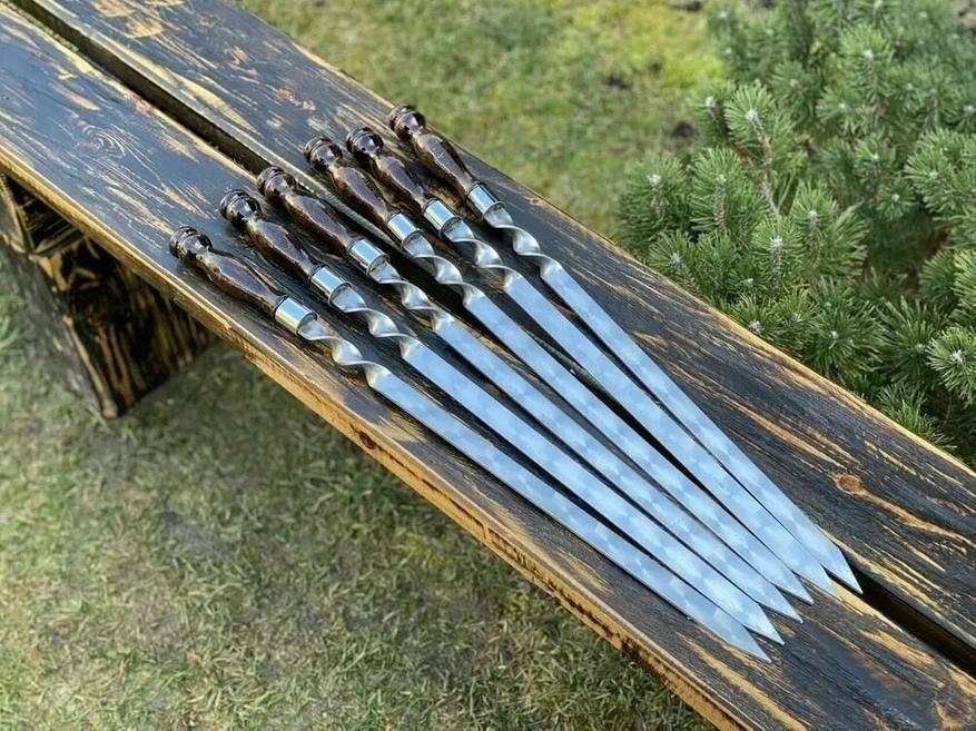 Шампура изготовлены из качественной стали AISI430, ручки из натурального дерева с лакокрасочным покрытием, нанесенным в несколько слоёв и хорошим креплением к основанию.