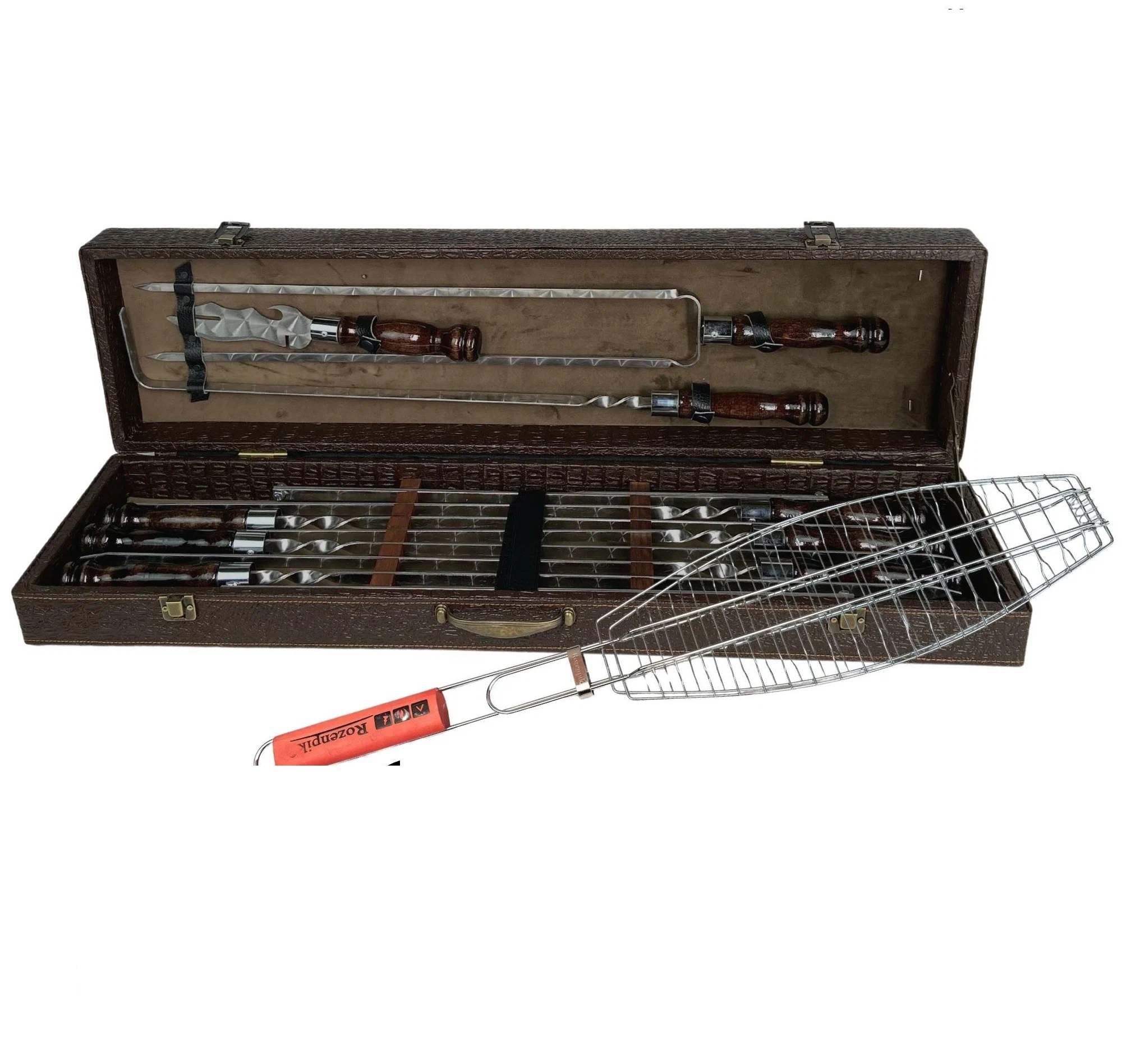 Для хранения имеется стильный чехол, изготовленный из массива берёзы и покрыт слоем лака, что придаёт ему стильный и богатый внешний вид. Шампура из стали, которая не поддаётся коррозии, рукоятка из бамбука. Общая длина шампуров 64 см, а рабочая — 45 см.