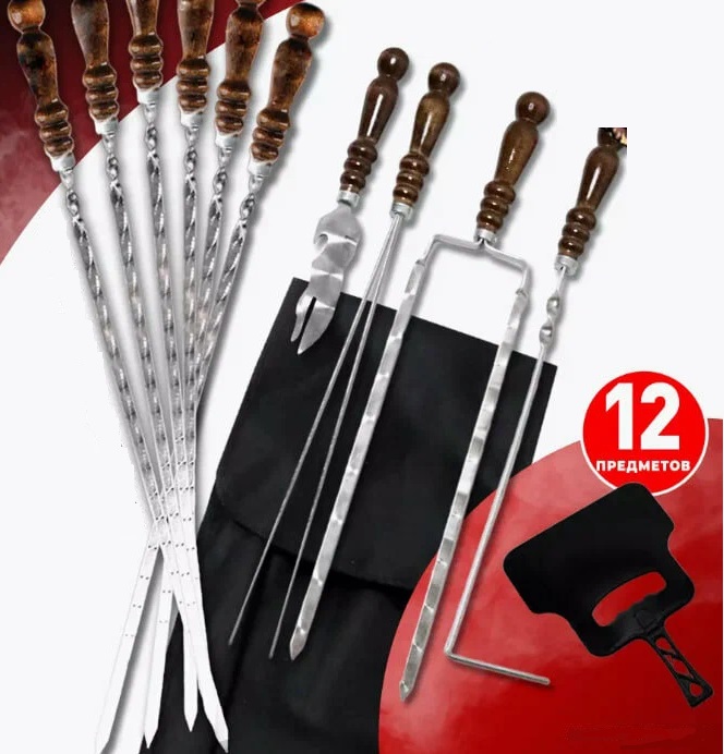 Продолжает подборку набор для шашлыка состоящий из 12-ти предметов, который может подойти как для домашнего использования, так и стать хорошим подарком для людей, которые любит активный отдых на природе и сами готовят шашлык.