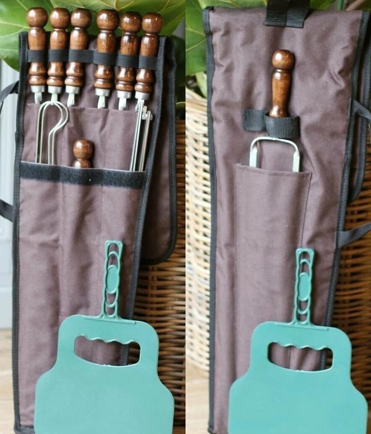 Для того, чтобы ваш отдых был более комфортный, все предметы с шашлычного набора хранятся в специальном чехле, длина которого составляет 70 см. Поэтому вы всегда можете взять его с собой в поход или рыбалку. Также, что немаловажно для отдыха на природе, имеются специальные опоры, которые могут сымитировать функциональность мангала.