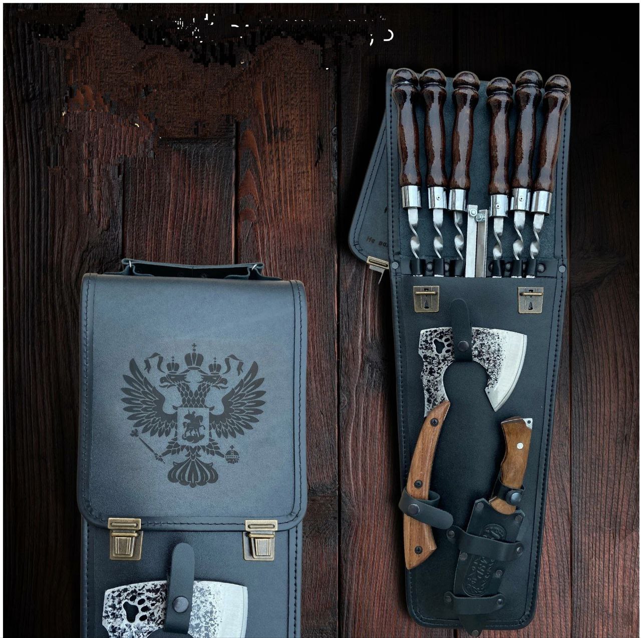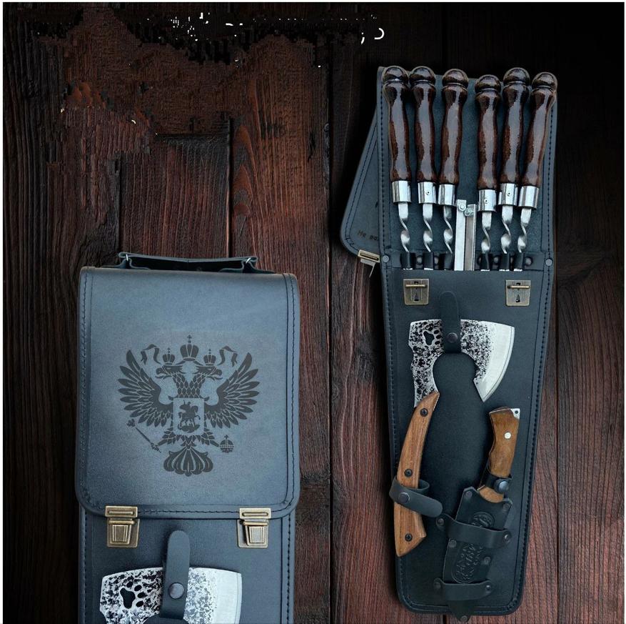 Чехол обтянут эко-кожей снаружи и велюром внутри, что придаёт элегантности и стиля. В набор входят полноразмерные шампура общей диной 58 см, а рабочая их длина составляет 35 см. Ручка деревянная с широким огнеупорным кольцом. В набор входит полноценный нож и кулинарный топорик, которые изготовлены из нержавеющей стали высокой твердости.