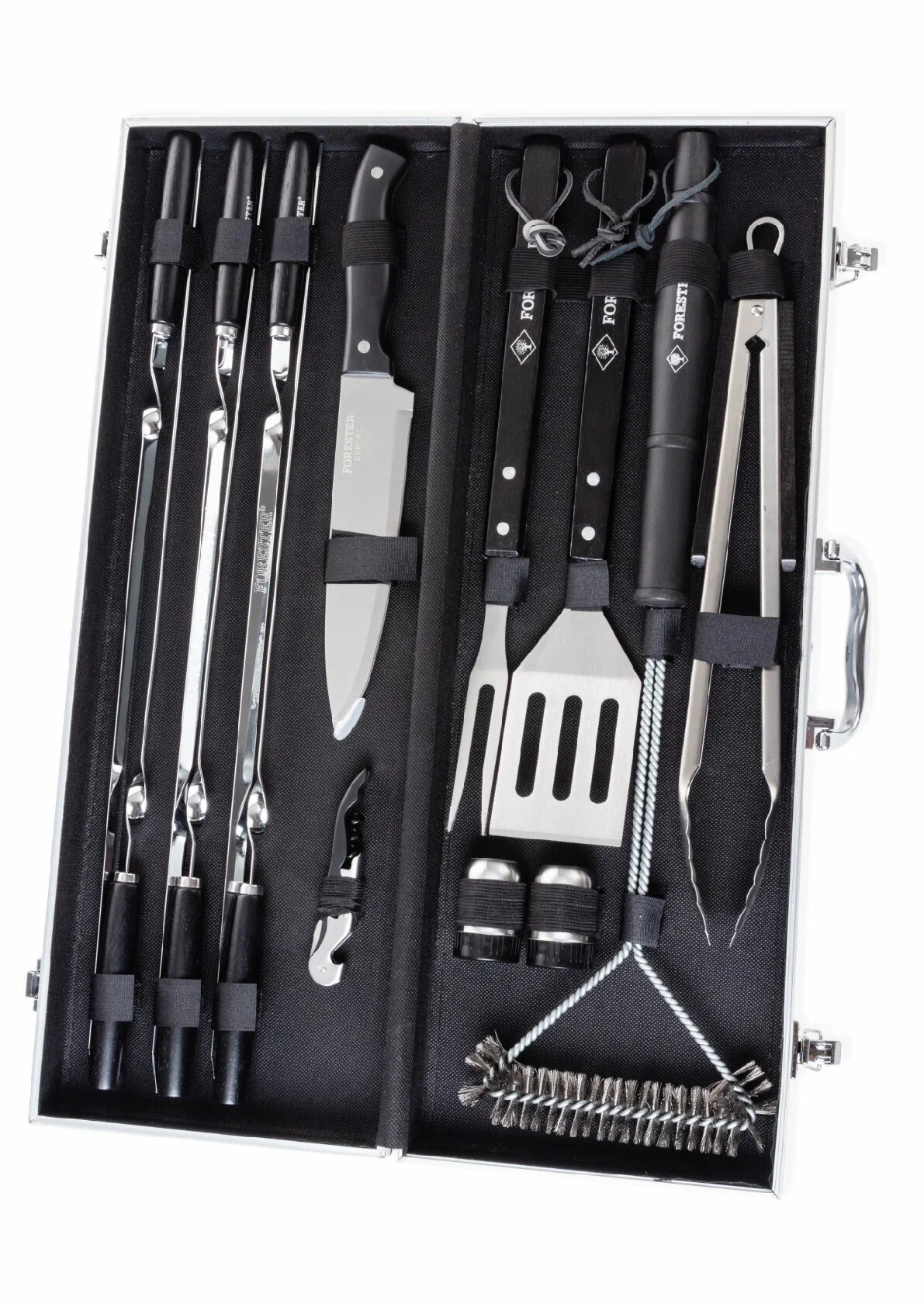 Продолжает подборку набор от бренда Forester. Данный набор подойдёт для отдыха на природе, или в любых других условиях, где вы захотите приготовить шашлык, овощи гриль или другие блюда на костре. Для это в наборе имеется все необходимое. Состоит набор из четырнадцати предметов, и все они размещены в удобном алюминиевом кейсе с замками, которые фиксируют каждый предмет на своем месте.