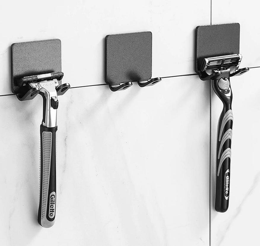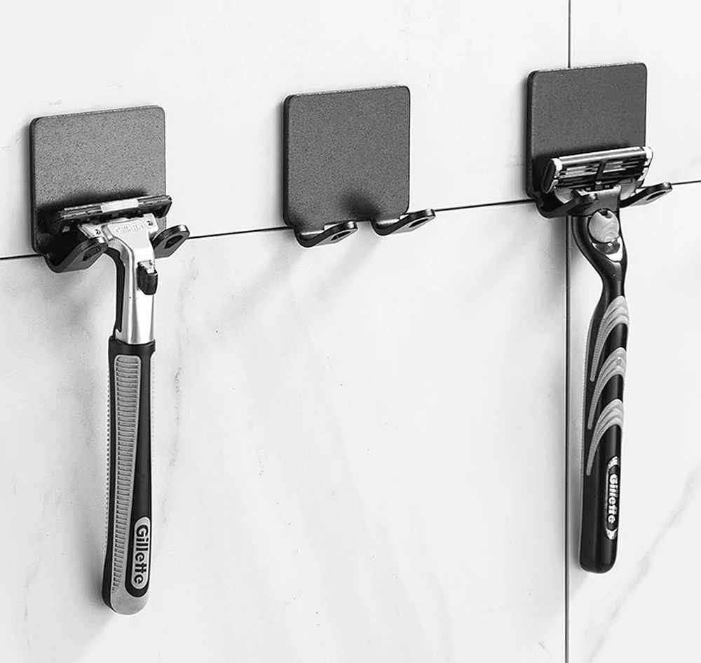 Простая, но чрезвычайно удобная штука для организации хранения бритвенных станков, которые вечно норовят потеряться или упасть. Держатель выполнен из крашенного алюминия и клеится на ровную вертикальную поверхность (например, плитку) на клейкую основу, которая идет в комплекте. Продаются держатели по две штуки, есть темного и светлого цвета.
