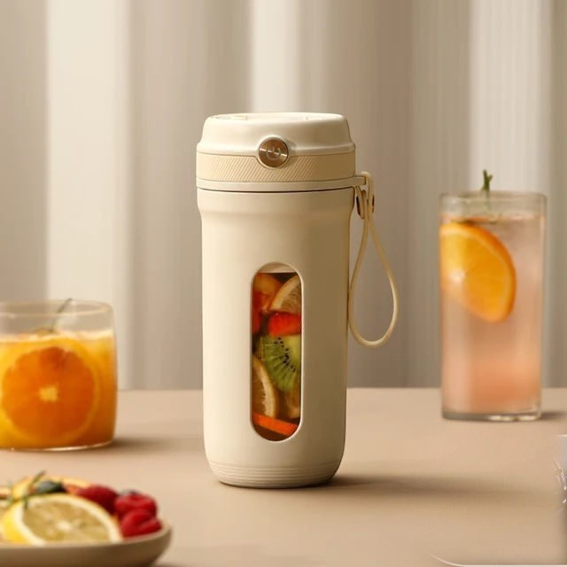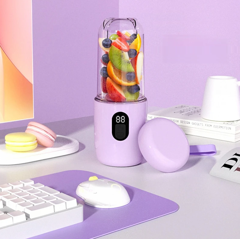Этот мини-блендер выполнен в формате чашки объёмом 350 мл и ориентирован на максимально простое и мобильное использование. Вес около 490 г, корпус из тритана, ножи и внутренние элементы — из нержавеющей стали. Обновлённая модель оснащена четырьмя лезвиями (вместо двух в старой версии), что делает её более эффективной при измельчении мягких фруктов, овощей и даже при подготовке лёгких коктейлей на основе молока или йогурта. Рабочая мощность 50 Вт, вращение до 18000 об/мин. Аккумулятор встроенный 1400 мАч, заряжается от USB (5В, 1А), используется беспроводной контактный интерфейс. В комплекте — прибор и базовая станция для подзарядки. Поддерживаются функции перемешивания, нарезки овощей, есть функция — реверс. Цвета — белый и розовый.