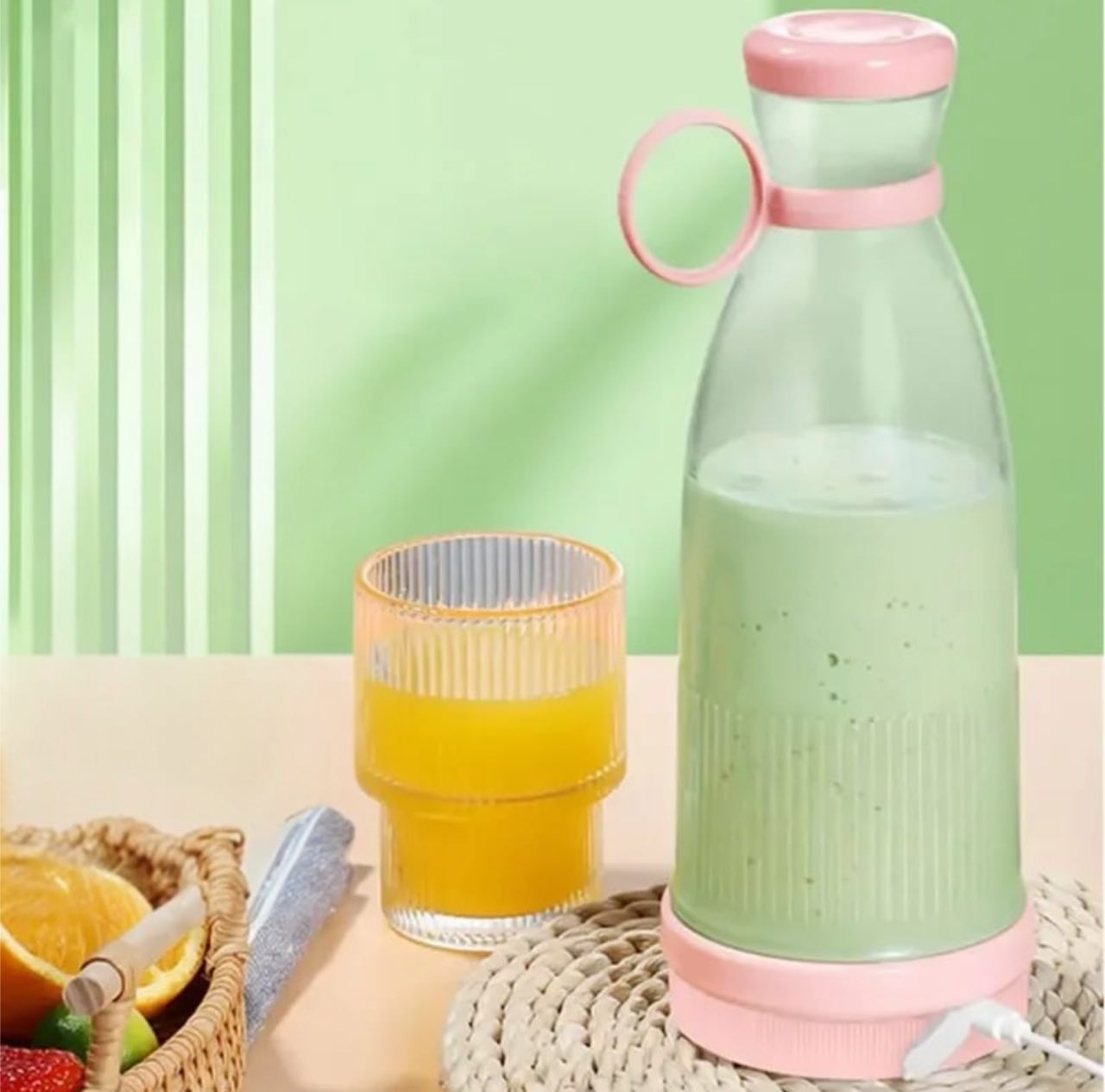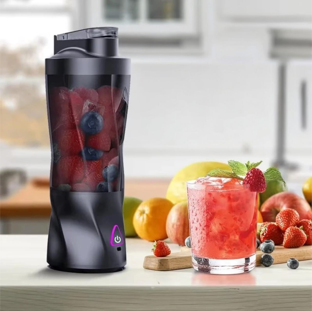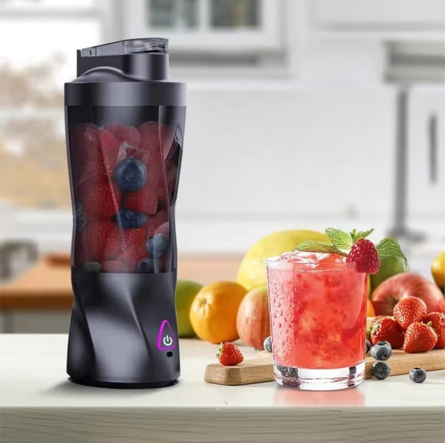 Портативный блендер с мощностью 150 Вт и скоростью до 22000 об/мин, способный за 30-40 секунд измельчить фрукты, лёд или белковые смеси. Оснащён шестью лезвиями из нержавеющей стали, обеспечивает равномерную текстуру и быстрое смешивание. Объём чаши 450 мл, вес около 600 г, встроенный аккумулятор заряжается от USB за 3 часа и рассчитан на приготовление до 25 порций. Работает без проводов, корпус выполнен из пластика без BPA, есть защита от случайного запуска и автоотключение. Все части, кроме основания, легко моются. Подходит для смузи, соков, детского питания и даже косметических смесей.
